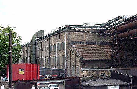 Das Gebläsehaus in Außenansicht. Die verschiedenen Bauabschnitte sind an der Gebäudefront gut zu erkennen. Der hochragende Lufteinlass gehört zum Elektrogebläse, dessen Zuluft gefiltert werden musste.